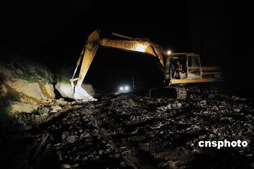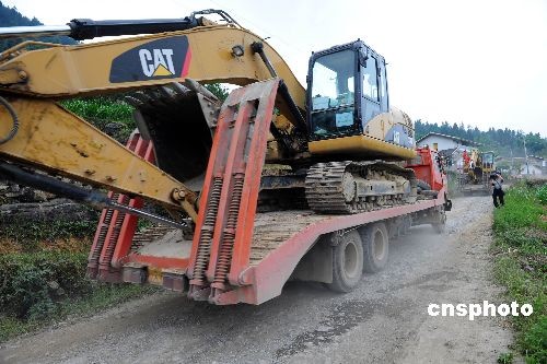 6月7日,大型救援設(shè)備駛?cè)胫貞c武隆山體垮塌現(xiàn)場(chǎng)。從6月6日17點(diǎn)開始,重慶市交委從渝湘高速公路建設(shè)工地調(diào)集了150余名技術(shù)骨干和20臺(tái)挖掘機(jī)、裝載機(jī)、壓路機(jī)、大型貨車,抽調(diào)武隆交通部門和沿線市民150余人及25臺(tái)大型機(jī)械設(shè)備對(duì)通往鐵礦鄉(xiāng)的28公里救援通道進(jìn)行搶修。中新社發(fā) 劉確樹 攝
