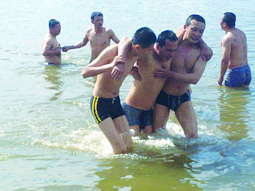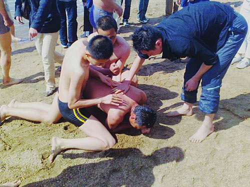 上岸之后,人們手忙腳亂地要學電視里的樣子給昏迷過去的韓德強擠壓心肺,小伙子再一次表現(xiàn)出來非凡的冷靜:“不能讓他仰臥!否則鼻腔里的水可能進入腦部。”小伙子半跪在岸邊把韓德強俯臥著放在自己腿上,拍打他的后背將水控了出來,絲毫沒在意自己的膝蓋已經(jīng)被尖銳的沙石擦傷,流出了鮮血。
