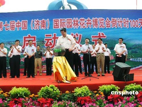 第七屆中國(濟(jì)南)國際園林花卉博覽會六月十四日在舉辦地山東省城濟(jì)南舉行了倒計(jì)時一百天啟動活動。第七屆中國(濟(jì)南)國際園林花卉博覽會是中國園林花卉界最高層次的盛會,每兩年舉辦一屆。是屆園博會將于二00九年九月二十二日至二0一0年五月在濟(jì)南舉行。圖為濟(jì)南市市長張建國啟動第七屆中國(濟(jì)南)國際園林花卉博覽會一百天倒計(jì)時牌。中新社發(fā) 張譯文 攝