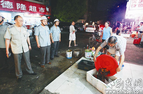 8時(shí)許,記者隨洪山區(qū)執(zhí)法隊(duì)來到圖書城路,遠(yuǎn)遠(yuǎn)便看到幾處燒烤攤上空煙霧繚繞、氣味嗆鼻,一家油燜大蝦店外,五六張餐桌橫亙?cè)谌诵械郎,桌上蝦殼堆成小山,桌下污水橫流。“老板,你這樣出店占道經(jīng)營違反了市容管理規(guī)定,請(qǐng)你配合一下,把桌子收到店里去吧。”“進(jìn)去哪有生意做?”勸說、宣傳無效,50名執(zhí)法隊(duì)員圍站成一圈,雙手背在身后,沉默地注視著食客和坐在一旁的老板。如此“對(duì)峙”了27分鐘后,兩桌食客先“頂”不住了,草草結(jié)賬離去,老板與另兩桌食客又“堅(jiān)持”了片刻,最終悻悻地收拾起桌椅搬進(jìn)了店內(nèi)。