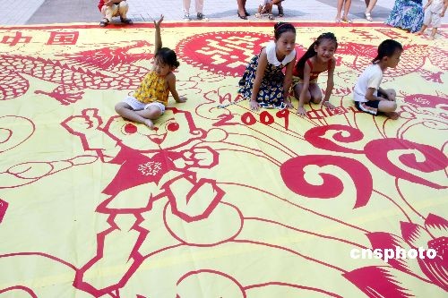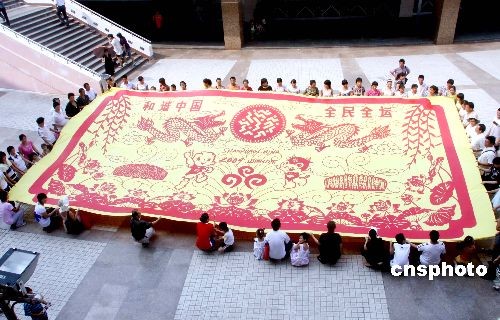 2009年7月5日,濟(jì)南剪紙藝術(shù)院的工作人員和市民在濟(jì)南市泉城廣場(chǎng)展示巨幅剪紙作品。當(dāng)天是第十一屆全運(yùn)會(huì)倒計(jì)時(shí)100天,濟(jì)南剪紙藝術(shù)院的120多名藝人耗時(shí)6個(gè)月,共同創(chuàng)作完成巨幅剪紙作品。據(jù)了解,該作品總面積61.6平方米,長11米(寓意第十一屆全運(yùn)會(huì)),寬5.6米(寓意56個(gè)民族),主題為和諧中國、全民全運(yùn)。作品中的圖案包含十一全運(yùn)會(huì)標(biāo)志、吉祥物泰山童子、荷花(濟(jì)南市花)、泉水等。中新社發(fā) 龔輝 攝
