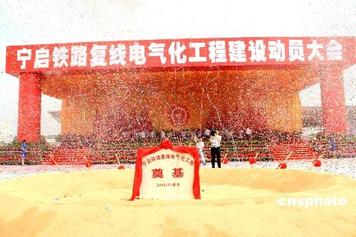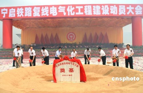 7月14日,寧啟鐵路復線電氣化工程建設(shè)動員大會在江蘇省泰州市泰州火車站舉行。國家鐵道部部長劉志軍、江蘇省委書記梁保華、省長羅志軍,上海鐵路局局長安路生以及泰州市委書記張雷等出席。寧啟線路全長約268.3公里,項目總投資139億元,工期3年。建成后南京至南通運行時間將從3小時50分縮短至1小時50分。圖為鐵道部、江蘇省有關(guān)領(lǐng)導共同為工程奠基。中新社發(fā) 崔佳明 攝