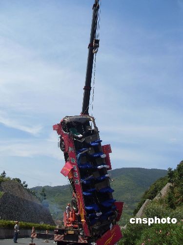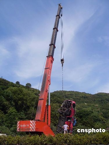 七月二十一日,沈海高速福安連接線一輛車(chē)牌為閩JY1230客車(chē)與一輛小轎車(chē)發(fā)生刮擦,墜入十幾米山澗并撞到一農(nóng)民,造成客車(chē)上三十五人中八人當(dāng)場(chǎng)死亡,送往醫(yī)院又確認(rèn)一人死亡。截止目前已造成九人死亡,另有二十七人受傷。圖為有關(guān)人員正在清理事故現(xiàn)場(chǎng)。中新社發(fā) 徐釗 攝