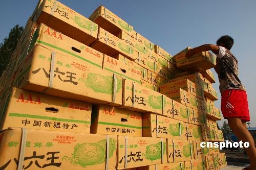 7月24日,新疆特產(chǎn)哈密瓜在北京新發(fā)地農(nóng)貿(mào)市場(chǎng)熱銷。時(shí)至盛夏,新疆的各色水果正陸續(xù)成熟,在當(dāng)?shù)毓r(nóng)喜迎豐收的同時(shí),相關(guān)政府部門采取措施幫助他們打開(kāi)銷路。7月21日,國(guó)家商務(wù)部和新疆維吾爾自治區(qū)政府在烏魯木齊組織召開(kāi)“新疆農(nóng)產(chǎn)品產(chǎn)銷對(duì)接洽談會(huì)”,來(lái)自廣東、北京等地的19家大型農(nóng)產(chǎn)品批發(fā)零售企業(yè)與當(dāng)?shù)毓⿷?yīng)商及生產(chǎn)基地簽訂近40萬(wàn)噸的采購(gòu)協(xié)議。中新社發(fā) 富田 攝