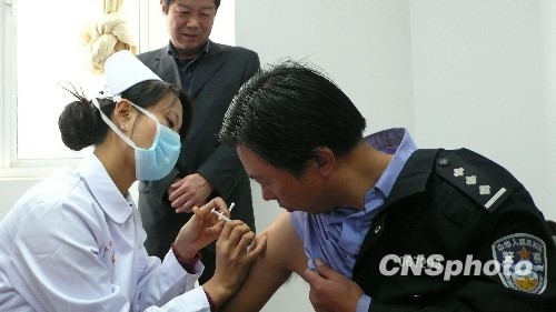 2009年11月5日,安徽省亳州市一線公安干警正在接種甲型流感疫苗。當(dāng)日,在安徽省亳州市第一批52500劑甲型流感疫苗開始接種,據(jù)市衛(wèi)生部門負(fù)責(zé)人介紹,因?yàn)橐呙绲臄?shù)量有限,按照省里計劃,這批疫苗的接種重點(diǎn)人群是,中小學(xué)教師和學(xué)生、公安干警、交通運(yùn)輸部門工作人員、殯葬工作人員,還有醫(yī)療衛(wèi)生部門的臨床一線和公共衛(wèi)生人員等。對于這批甲型流感疫苗,亳州市衛(wèi)生部門還確定了專門人員,確保對重點(diǎn)人群進(jìn)行接種。中新社發(fā) 劉勤利 攝