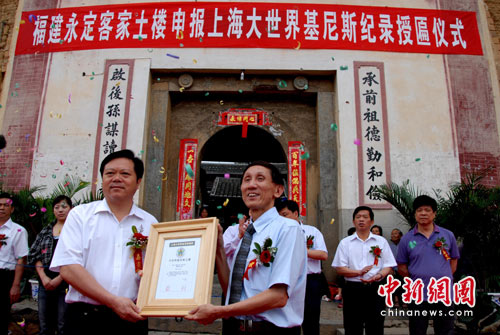 6月12日上午,上海大世界基尼斯總部在世界遺產(chǎn)永定“承啟樓”舉行授匾儀式。上海大世界基尼斯總部將“大世界基尼斯之最·擁有‘福建土樓’最多的縣——福建省永定縣”的匾牌授予永定縣,標(biāo)志著永定客家土樓成為基尼斯記錄中的重要一員。 匾牌上銹刻著:該縣現(xiàn)存“福建土樓”23000座,遍布各個鄉(xiāng)鎮(zhèn)、村落,其中圈數(shù)最多、建筑規(guī)模最大的為“承啟樓”;最高的為“永隆昌樓”;最古老的為“龍安寨”(始建于唐朝)。 劉永良 攝
