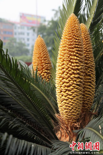 記者在現(xiàn)場看到,小區(qū)院壩內(nèi)共種植的10株鐵樹,都長得非常茂盛,其中有7株鐵樹開了花,其余的3株也現(xiàn)了花芽;其中1株鐵樹開了3朵雄花,2株鐵樹都開了2朵雄花,2株鐵樹均是今年開的雌花和去年結(jié)的紅色果實(shí)同時(shí)呈現(xiàn),另外還有2株鐵樹開了雌花。