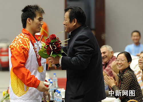 中新網(wǎng)10月24日晚濟(jì)南電(作者 王勇)24日晚舉行的十一運(yùn)男子77公斤舉重比賽頒獎(jiǎng)儀式中,發(fā)生了感人的一幕。以總成績(jī)374公斤打破全國(guó)紀(jì)錄并獲得冠軍的解放軍選手蘇達(dá)金,在接受鮮花后立刻沖下獎(jiǎng)臺(tái),奔向坐在嘉賓席上的國(guó)家體育局摔柔運(yùn)動(dòng)管理中心主任馬文廣先生,向老師獻(xiàn)花表達(dá)謝意。