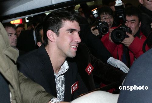 1月10日,在2008北京奧運會上奪得8枚金牌的美國游泳選手菲爾普斯(michael phelps),抵達(dá)北京首都國際機(jī)場。此次他將為一家汽車廠商進(jìn)行代言活動,并拍攝宣傳片,工作之余,他還將到自己創(chuàng)造輝煌的國家游泳中心“水立方”參觀。中新社發(fā) 杜洋 攝