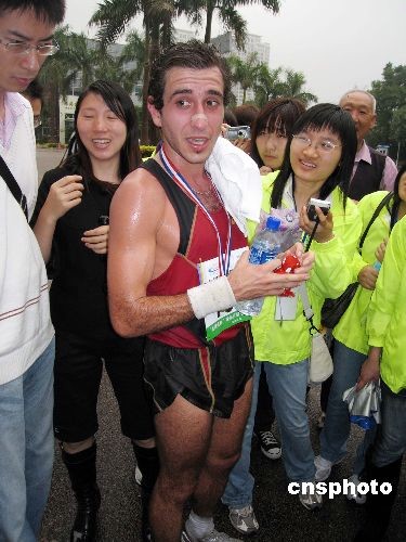 “九洲杯”珠海首屆半程馬拉松邀請(qǐng)賽于二十二日早上八點(diǎn)鳴槍起跑,該項(xiàng)賽事吸引了境內(nèi)外兩千名長(zhǎng)跑愛好者參加。經(jīng)過(guò)一番角逐,本次半程馬拉松賽的男子總冠軍由亞洲半程馬拉松紀(jì)錄保持者、香港選手史提芬奴贏得,女子總冠軍則由十六歲的中國(guó)籍女孩楊麗文奪得。圖為史提芬奴在結(jié)束比賽后接受記者的訪問(wèn)。中新社發(fā) 鄧媛雯 攝