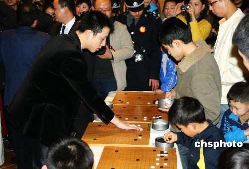 3月7日,被媒體譽為當今中國圍棋“一哥”的古力(左)在重慶與10位圍棋愛好者展開“車輪大戰(zhàn)”。在現(xiàn)場,古力盡顯大將風范,在讓10位棋友6子前提下,仍是輕松占取優(yōu)勢。從2008年1月至今的14個月內(nèi),古力總共獲得14個國內(nèi)外圍棋冠軍頭銜。中新社發(fā) 孟幻 攝