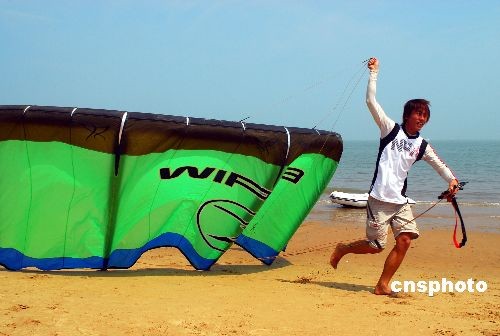 3月19日,為期兩天的“2009?诜弭唢L(fēng)箏沖浪邀請賽”在?谑形餍愫╅_幕。這是我國首次舉辦國際性風(fēng)箏沖浪大賽。比賽設(shè)公開級風(fēng)箏沖浪場地賽、風(fēng)箏沖浪自由花式賽、公開級帆板場地賽和特邀組帆板場地賽等多個項目。中新社發(fā) 善平 攝