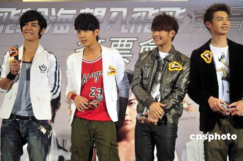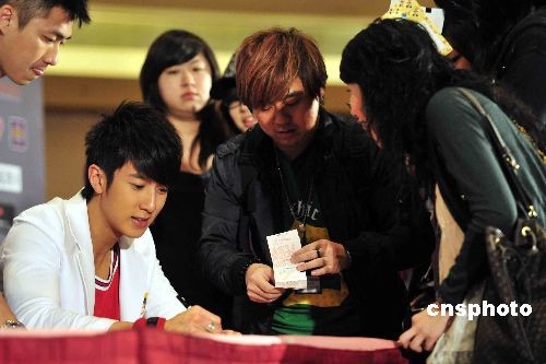 二月二十六日,臺(tái)灣組合“飛輪!痹谙愀垡簧虉雠e行簽名活動(dòng),為其即將舉行的演唱會(huì)造勢(shì)。中新社發(fā) 譚達(dá)明 攝