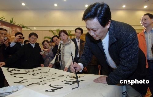 三月二十四日,在電視連續(xù)劇《鄭和下西洋》中飾演明成祖朱棣的著名演員唐國強(qiáng)在福州舉行的該劇開播儀式上現(xiàn)場揮毫題字。該劇是為紀(jì)念鄭和下西洋600周年特別拍攝的,由福建省委宣傳部、中央電視臺(tái)文藝中心影視部及長樂市委、市政府等單位聯(lián)合出品!多嵑拖挛餮蟆肥吩姲愕孛枋隽肃嵑吐暑I(lǐng)船隊(duì)七下西洋,歷時(shí)二十九年,成功開辟海上絲綢之路的壯舉,展現(xiàn)了鄭和七次下西洋在政治、經(jīng)濟(jì)、文化、外交、科技等領(lǐng)域取得的輝煌成就。中新社發(fā) 劉可耕 攝