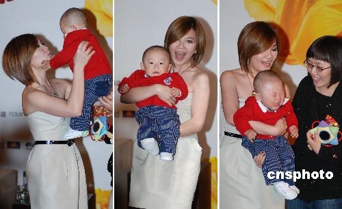 4月20日,馬來西亞“情歌天后”梁靜茹亮相北京,出席將于5月27號舉辦的“2009梁靜茹今天情人節(jié)北京演唱會”發(fā)布會。 在梁靜茹2005年北京演唱會上,有一位男孩在梁靜茹的鼓勵下向愛人求婚,終成連理。前不久,他們的寶寶出世。發(fā)布會當日,一家三口特別來到現(xiàn)場為梁靜茹加油。而他們的寶寶也成為梁靜茹年齡最小的“粉絲”。圖為梁靜茹抱起小“粉絲”,十分開心。中新社發(fā) 李學仕 攝