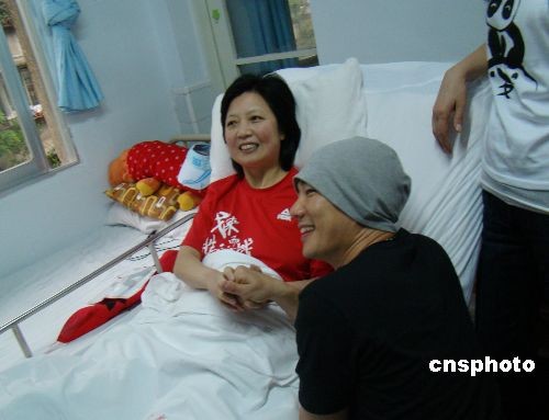 汶川大地震一周年之際,香港華光功德會(huì)愛心大使任賢齊、琦琦、汪詩(shī)詩(shī)一行于5月7日中午來到四川省人民醫(yī)院,探訪了仍然留院療傷的傷患者,并與地震傷員一起唱歌、游戲,還親手參與了“十字繡”等手工藝品的制作。此外,3人還一口氣簽下了65件愛心T恤,共同為地震傷員發(fā)起的“心啟程”活動(dòng)儲(chǔ)備愛心基金。圖為明星們到病房慰問傷員。中新社發(fā) 王萌 攝