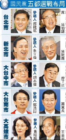 據(jù)了解,黨中央規(guī)劃的陣容,大高雄市由王金平出任,臺(tái)北市由吳伯雄擔(dān)任,新北市交給吳敦義負(fù)責(zé),大臺(tái)中市是由曾任臺(tái)中縣長(zhǎng)的廖了以擔(dān)綱,大臺(tái)南市則由出身嘉義市的蕭萬長(zhǎng)出馬。