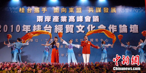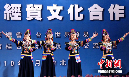 中新網(wǎng)臺北7月4日電(廖祖平)中共廣西壯族自治區(qū)委員會書記郭聲琨率領(lǐng)1000余人的廣西經(jīng)貿(mào)文化代表團(tuán)7月1日—7月5日在臺灣參訪,這是海峽兩岸經(jīng)濟(jì)合作框架協(xié)議(ECFA)簽署后大陸第一個(gè)赴臺的經(jīng)貿(mào)文化代表團(tuán)?图胰司劬拥膹V西賀州市也由市委書記彭曉春率賀州代表團(tuán)隨廣西團(tuán)一起赴臺。7月3日下午,由桂臺(賀州)客家文化旅游合作示范區(qū)與臺灣世界客屬總會、廣西同鄉(xiāng)會聯(lián)合主辦的桂臺(賀州)客家文化旅游經(jīng)貿(mào)合作懇談會在臺北舉行。