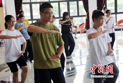 中新網(wǎng)7月5日電 7月5日,32名參加“2010年海峽兩岸青年聯(lián)歡節(jié)•中醫(yī)藥傳統(tǒng)文化研習(xí)營(yíng)”的臺(tái)灣高校學(xué)子在福建中醫(yī)藥大學(xué)福州旗山校區(qū)學(xué)練24式太極拳。