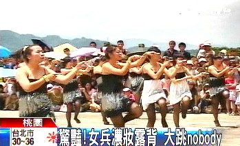 中新網(wǎng)7月10日電 據(jù)臺(tái)灣TVBS報(bào)道,臺(tái)灣陸軍桃園空旗旅營(yíng)區(qū)10日開(kāi)放,除了直升機(jī)秀和儀隊(duì)操槍表演之外,營(yíng)區(qū)20位女軍官特別化起濃妝,穿上高跟鞋和露背裝,大跳苦練一個(gè)月的“NOBODY”。她們笑說(shuō),沒(méi)想到跳舞比操戰(zhàn)技還要累。