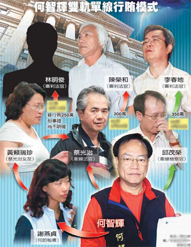 何智輝與高院法官蔡光治是多年好友,何智輝的秘書謝燕貞和蔡光治的女友黃賴瑞珍更是20多年前幼教工作的同事;板橋地檢署主任檢察官邱茂榮則因曾在苗栗地檢署做過(guò)主任檢察官,與當(dāng)過(guò)苗栗縣長(zhǎng)的何智輝早已熟識(shí)。何智輝于是運(yùn)用兩個(gè)女人當(dāng)中間人,再利用司法官之間同學(xué)、同事情誼,各自對(duì)承審法官行賄。