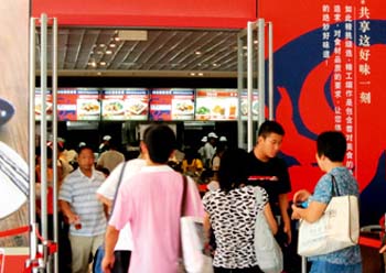 上海天氣炎熱,游客看世博熱情不減。進入世博園區(qū)發(fā)現(xiàn),世博美食正掀起面食大戰(zhàn),四川擔擔面、蘭州拉面等各種知名面食在園區(qū)擺開架式招攬食客,臺灣牛肉面也因為口味地道,吸引了游客的目光。這其中最紅火的就有康師傅私房牛肉面、真鍋咖啡和老董牛肉面三家。