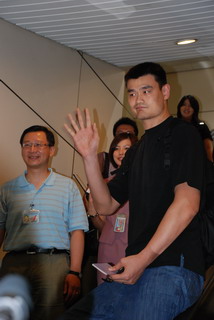 據(jù)報(bào)道,來(lái)臺(tái)灣參加慈善活動(dòng)的美國(guó)職籃火箭隊(duì)當(dāng)家中鋒姚明,26日下午搭乘華航班機(jī)來(lái)臺(tái),立刻受到大家熱烈包圍,桃園縣長(zhǎng)吳志揚(yáng)前往機(jī)場(chǎng)接機(jī),贈(zèng)送桃園縣農(nóng)特產(chǎn)品給姚明,希望在臺(tái)灣期間可以好好品嘗一下,姚明也回贈(zèng)這次活動(dòng)一件球衣給吳縣長(zhǎng)。