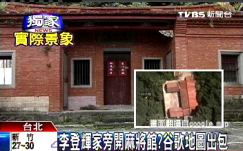 中新網(wǎng)8月3日電 谷歌地圖(google earth)在臺灣又惹上麻煩事,繼之前拍到窗臺裸女及路口“尿尿男”后,日前有民眾在谷歌地圖上發(fā)現(xiàn),李登輝的住家“翠山莊”旁邊有一間“麻將館”,誰知警察前往調(diào)查時(shí),卻發(fā)現(xiàn)被標(biāo)為“麻將館”的地方其實(shí)是空置的三合院。