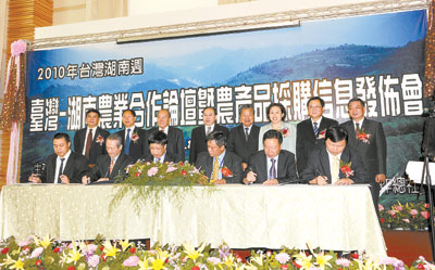 8月6日上午,在臺(tái)南走馬瀨農(nóng)場(chǎng)舉行了“臺(tái)灣-湖南農(nóng)業(yè)合作論壇暨農(nóng)產(chǎn)品采購(gòu)信息發(fā)布會(huì)”。湘臺(tái)農(nóng)業(yè)界人士200余人參加了洽談會(huì)。臺(tái)灣海峽兩岸農(nóng)業(yè)協(xié)會(huì)與湖南省農(nóng)業(yè)產(chǎn)業(yè)協(xié)會(huì)簽訂了“湘臺(tái)農(nóng)業(yè)合作備忘錄”;湘臺(tái)相關(guān)企業(yè)簽訂了“臺(tái)灣茶葉采購(gòu)意向書(shū)”、“臺(tái)灣水產(chǎn)品、水果等農(nóng)產(chǎn)品采購(gòu)合作意向書(shū)”、“臺(tái)灣食品采購(gòu)合同”、在湖南各大超市設(shè)立“苗栗縣卓蘭鎮(zhèn)水果專(zhuān)柜”合作意向;湖南省供銷(xiāo)合作社發(fā)布了農(nóng)產(chǎn)品采購(gòu)信息。兩地農(nóng)業(yè)界表示將攜手合作,取長(zhǎng)補(bǔ)短,推動(dòng)兩地農(nóng)業(yè)共同發(fā)展。