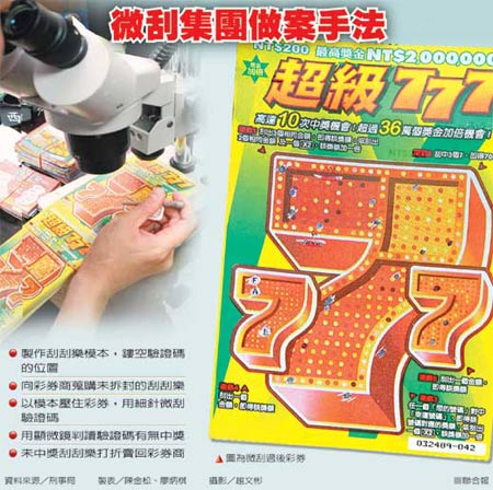 據(jù)臺灣《聯(lián)合報》報道,今年6月,臺灣彩券公司接獲彩券經(jīng)銷商檢舉,指稱市面出現(xiàn)八八折不連號彩券,來源可疑,臺彩取得部分已遭微刮彩券的“黑心刮刮樂”,送往印制彩券的公司檢驗(yàn),印制商確認(rèn)彩券遭到微刮,安全主管還說:“21年工作經(jīng)驗(yàn)里,第一次看到如此精密的微刮手法!