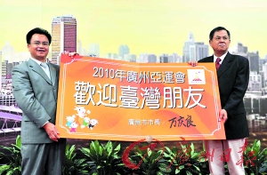 萬慶良向臺(tái)灣同胞致送亞運(yùn)會(huì)邀請(qǐng)函。