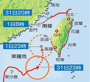 臺(tái)灣氣象部門(mén)預(yù)計(jì),臺(tái)風(fēng)形成的暴風(fēng)圈未來(lái)可能將橫掃過(guò)臺(tái)灣東南部及中南部陸地。31日凌晨,臺(tái)灣中南部地區(qū)迎來(lái)暴風(fēng)雨,傳出零星災(zāi)情,臺(tái)中已有一人喪生。