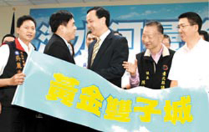 中新網(wǎng)9月6日電 據(jù)臺(tái)灣《中國時(shí)報(bào)》報(bào)道,臺(tái)北市長郝龍斌與國民黨新北市長參選人朱立倫5日大陣仗召開記者會(huì),公布“黃金雙子城--淡水河曼哈頓計(jì)劃”廣告片,這是在臺(tái)北市“花風(fēng)暴”之后,郝、朱兩人首度同臺(tái)為選情造勢(shì)。郝、朱拿著“黃金雙子城、團(tuán)結(jié)一定成”的布條,表達(dá)未來仍將持續(xù)推動(dòng)雙城合作的決心。