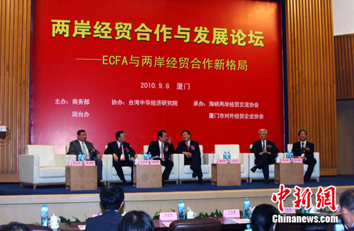 中新社廈門9月8日電(記者 林永傳)由中國國家商務(wù)部、國務(wù)院臺辦主辦的第五屆兩岸經(jīng)貿(mào)合作與發(fā)展論壇,8日下午在廈門國際會展中心國際廳舉行,兩岸學(xué)術(shù)界和工商界知名人士圍繞“ECFA與兩岸經(jīng)貿(mào)合作新格局”的主題進行深入探討。