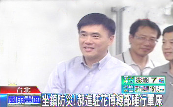中新網(wǎng)9月19日電 據(jù)臺灣TVBS電視臺報道,臺北市長郝龍斌18日晚間進駐花博營運總部,聽取最新臺風(fēng)動態(tài)簡報,簡報結(jié)束后,直接安排在總部過夜,就睡在一張簡單的行軍床上,隨時做好機動準(zhǔn)備。
