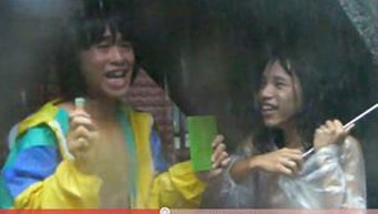影片一開始,出現(xiàn)一名戴著假發(fā),穿著透明雨衣,裸上半身只穿四角褲的男大學(xué)生,當起記者來,夸張地演出被強風吹倒在地,不但藍色雨傘開了花,整個人還翻了過去。接著竟然SNG連線起來。