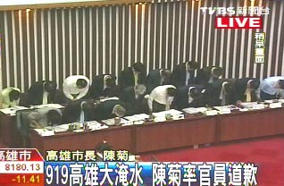 中新網(wǎng)9月28日電 據(jù)臺(tái)灣TVBS報(bào)道,針對(duì)919“凡亞比”臺(tái)風(fēng)造成高雄市大淹水,市長(zhǎng)陳菊連日來(lái)遭到相當(dāng)多的指控,今日,在市議會(huì)總質(zhì)詢時(shí),陳菊特別率領(lǐng)市府官員向市民道歉。