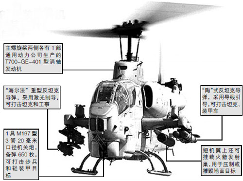 AH-1W武裝直升機(jī)機(jī)長約18米,高4米,最大起飛重量近6700公斤,采用串列座艙設(shè)計,由2名機(jī)組成員操控,裝備有機(jī)關(guān)炮、火箭彈、空空導(dǎo)彈和反坦克導(dǎo)彈,是目前臺軍直升機(jī)部隊中攻擊力最強的機(jī)型。(何西)
