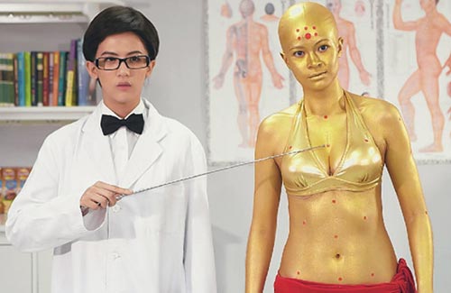 以勁爆光頭造型示人的柯念萱,為了這個造型就花了2個多小時打扮,穿上武裝片中的頭套后,還要仔細(xì)的漆上金漆,不時提心吊膽擔(dān)心油漆刷到臉上。柯念萱脫下衣服后,才驚覺百密總有一疏,“身上有些地方都沾到金漆了啦!要洗好久!”翁子麒戴假發(fā)也是忍著悶熱拍攝。