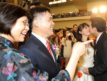 中新網(wǎng)10月11日電 據(jù)臺(tái)灣“今日新聞網(wǎng)”報(bào)道,臺(tái)北市政府10日下午舉行“花現(xiàn)臺(tái)北2010聯(lián)合婚禮”,臺(tái)北市長(zhǎng)郝龍斌與夫人高閬仙現(xiàn)身為140對(duì)新人證婚,并祝福新人“幸福久久、十全十美、雙雙對(duì)對(duì)、萬(wàn)年富貴”。