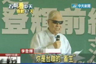 中新網(wǎng)10月12日電 據(jù)臺灣“今日新聞網(wǎng)”報道,“你是臺聯(lián)(‘臺聯(lián)黨’)的‘畜生’!”李登輝11日在替民進(jìn)黨新北市長參選人蔡英文站臺時出現(xiàn)口誤。或許是真的年紀(jì)大了,李登輝這次替蔡英文助陣,不但講到激動處時,手抖個不停,還口誤連連,讓坐在一旁的蔡英文只能尷尬地笑。
