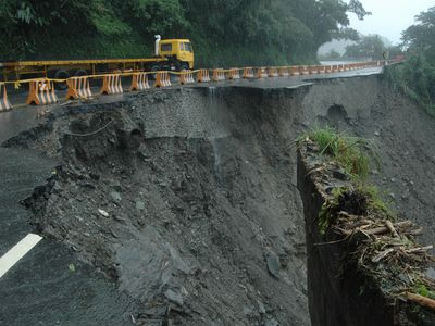 遭遇豪雨的蘇花公路遇雨則坍,南方澳到東澳間多處坍方。臺(tái)灣“災(zāi)害應(yīng)變中心”表示,一輛弘泰旅游公司載運(yùn)大陸觀光客的游覽車在東澳受困,疑被落石擊中,大陸導(dǎo)游及司機(jī)困在變形車體內(nèi),深夜確定2人死亡,其他旅客無恙;另傳有一輛創(chuàng)意旅游公司的游覽車,搭載廣東團(tuán)共19人失聯(lián)。