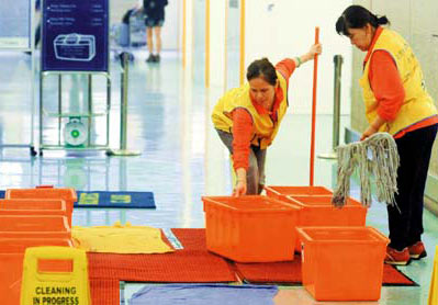 為了避免影響觀瞻,桃園航空站原本規(guī)定室內(nèi)漏水不得用水桶承接,只能用地毯或毛巾放在地上吸水,飽和后再擰到水桶搬走?墒亲蛱斓穆┧刻螅靥杭懊硪呀(jīng)無法應(yīng)付,清潔人員還是被迫搬來十多個水桶接水。
