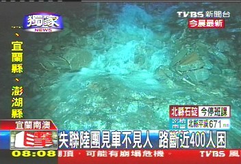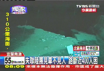 中新網(wǎng)10月22日電 據(jù)臺灣TVBS報道,宜蘭大淹水,蘇花公路更是處處坍方,甚至傳出有大陸游客團(tuán)的游覽車受困。該媒體記者挺進(jìn)現(xiàn)場,只看到游覽車空車,人員不知去向,不知是否平安;臺九線大約115公里處,部分路段的路基完全被淘空,土石滑落一兩百米的山下,附近路面更變成小溪、不斷淹水。