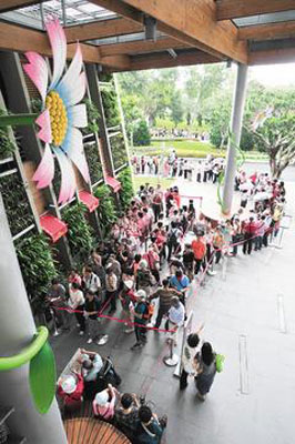 另外,針對(duì)夢(mèng)想館、養(yǎng)生館、真相館、名人館、故事館等5個(gè)展館,花博總部采發(fā)放預(yù)約券入館,從早上9點(diǎn)開(kāi)始一次發(fā)放,發(fā)完為止;其中最熱門(mén)的夢(mèng)想館,每日發(fā)放四千張預(yù)約券,25日上午到11時(shí)左右則發(fā)了兩千多張,并未如預(yù)期“暢銷(xiāo)”;而之前同樣熱門(mén)的“夢(mèng)想劇場(chǎng)”,因不發(fā)放預(yù)約券,采用現(xiàn)場(chǎng)排隊(duì),場(chǎng)外則是大排長(zhǎng)龍。