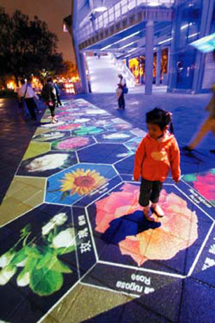 投影光雕有五個(gè)互動(dòng)設(shè)計(jì),測(cè)試階段只展演“花語(yǔ)寄情”,一踩在投影花苞上,玫瑰、向日葵、茶花、梅花等花卉就會(huì)瞬間盛開,還會(huì)出現(xiàn)花卉信息,朵朵投影互動(dòng)花海,恰與一旁地景花!罢婊ā毙纬捎腥(duì)比。
