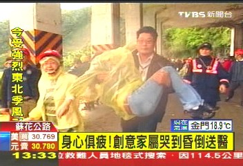 據(jù)臺灣TVBS電視臺報道,蘇花公路搜救行動已進入第7天,20名失聯(lián)大陸游客的任何消息都牽動著他們家屬的心。焦急等待的心情加上惡劣氣候,使得一名創(chuàng)意旅行社失聯(lián)大陸游客家屬在今(27)日中午哭到昏倒,送醫(yī)救治。
