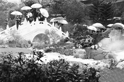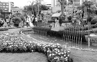 圓山公園展區(qū)戶外的大陸庭園內(nèi),只有緊挨在一起的上海和西安展區(qū)。上海展區(qū)內(nèi)有小橋流水,花草吐香,最為顯眼,且最能引起人們對舊上海歷史與文化回憶的設(shè)計,則是由植栽構(gòu)成的石庫門建筑。