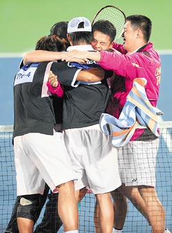 中新網(wǎng)11月15日電 據(jù)臺(tái)灣《中國時(shí)報(bào)》報(bào)道,中華臺(tái)北亞運(yùn)代表團(tuán)在廣州亞運(yùn)會(huì)第二天收獲豐碩,上屆在金牌戰(zhàn)失手的軟式網(wǎng)球男子團(tuán)體賽,昨日借著林鼎鈞與劉家綸在決勝點(diǎn)演出精采逆轉(zhuǎn),以二比一后來居上擊敗日本隊(duì),替中華臺(tái)北代表團(tuán)奪得廣州亞運(yùn)首金。