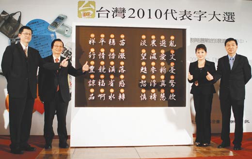 她指出,今年候選的40個(gè)代表字多具祥和的正面力量,但“亂”字依然連續(xù)三年入圍。她透露,遠(yuǎn)東集團(tuán)董事長(zhǎng)徐旭東選的代表字是“新”字,理由包括:ECFA創(chuàng)造“新”契機(jī)、“新”市場(chǎng)、花博展現(xiàn)的華人力量讓全世界耳目一“新”、“五都”選舉將展現(xiàn)“新”面貌等。黃晴雯自己則選“愛(ài)”字。